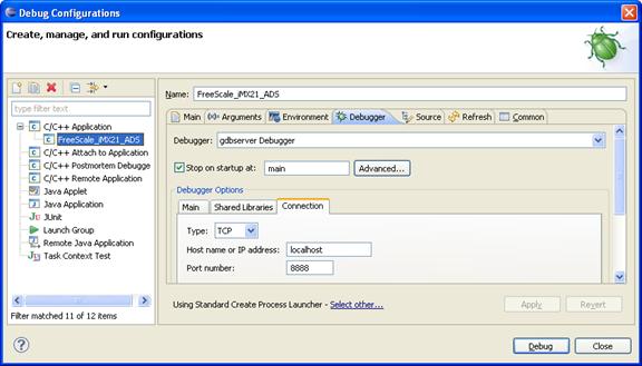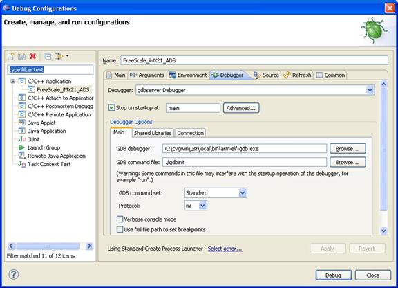i) Debugger tab: Debugger Options : Main tab : Gdb Debugger : Use Browse button to select your debugger either “arm-elf-gdb”, m68k-elf-gdb”,”mips-elf-gdb”, x86-elf-gdb” or “powerpc-elf-gdb” in either c:\cygwin\usr\local\bin (WINDOWS) or /usr/local/bin (LINUX)