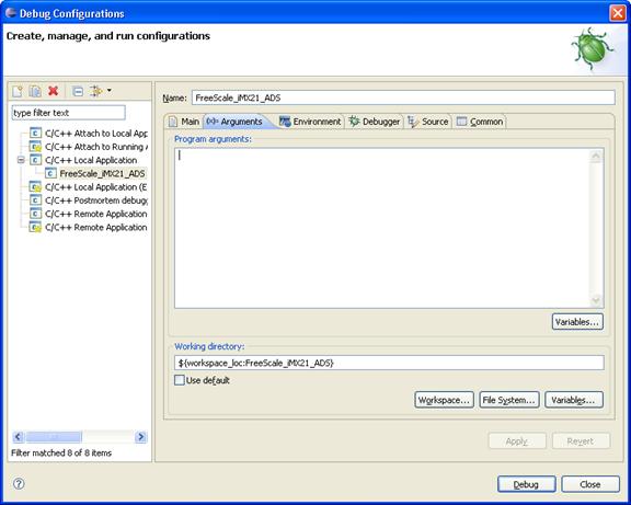 · Review/verify the parameters in the Debug Configuration Dialog tabs: